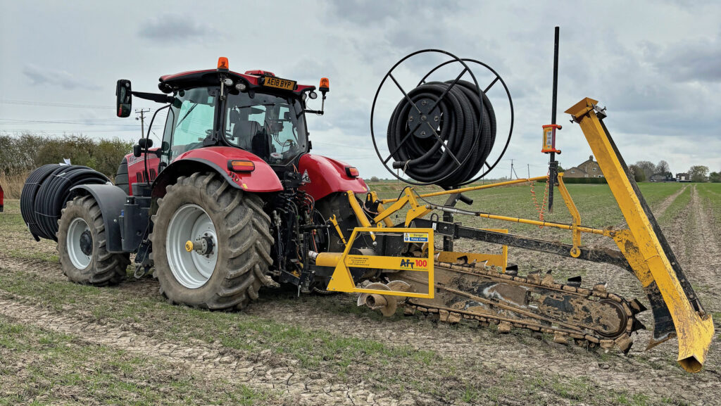 The Meads purchased the AFT100 trencher for £35,300, a significant investment in their drainage solution. In addition to the trencher, they also acquired a Herbst gravel trailer for £9,500, which would enable them to efficiently transport and lay gravel in the trenches. To complement the trencher, the Meads custom-built a front linkage-mounted blade, fashioned from an old Farmforce front press, to fill in the trenches after pipe laying. This innovative solution allowed them to push soil back into the trench, creating a neat and even surface. Before commencing the drainage work, the Meads collaborated with Lincolnshire Drainage Services to survey their fields and design the most efficient drainage system. This expert guidance ensured that the Meads’ DIY approach would be effective in tackling their waterlogging issues. With their equipment and plan in place, the Meads were ready to start digging and transforming their land.