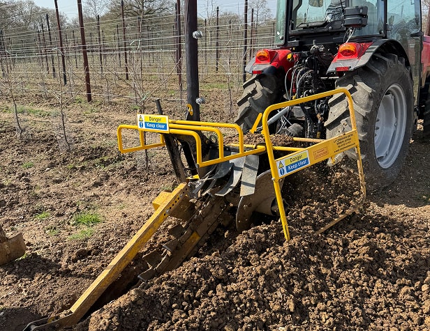 • Easy backfilling with spoils on one side (you only need a simple blade on your tractor to backfill)